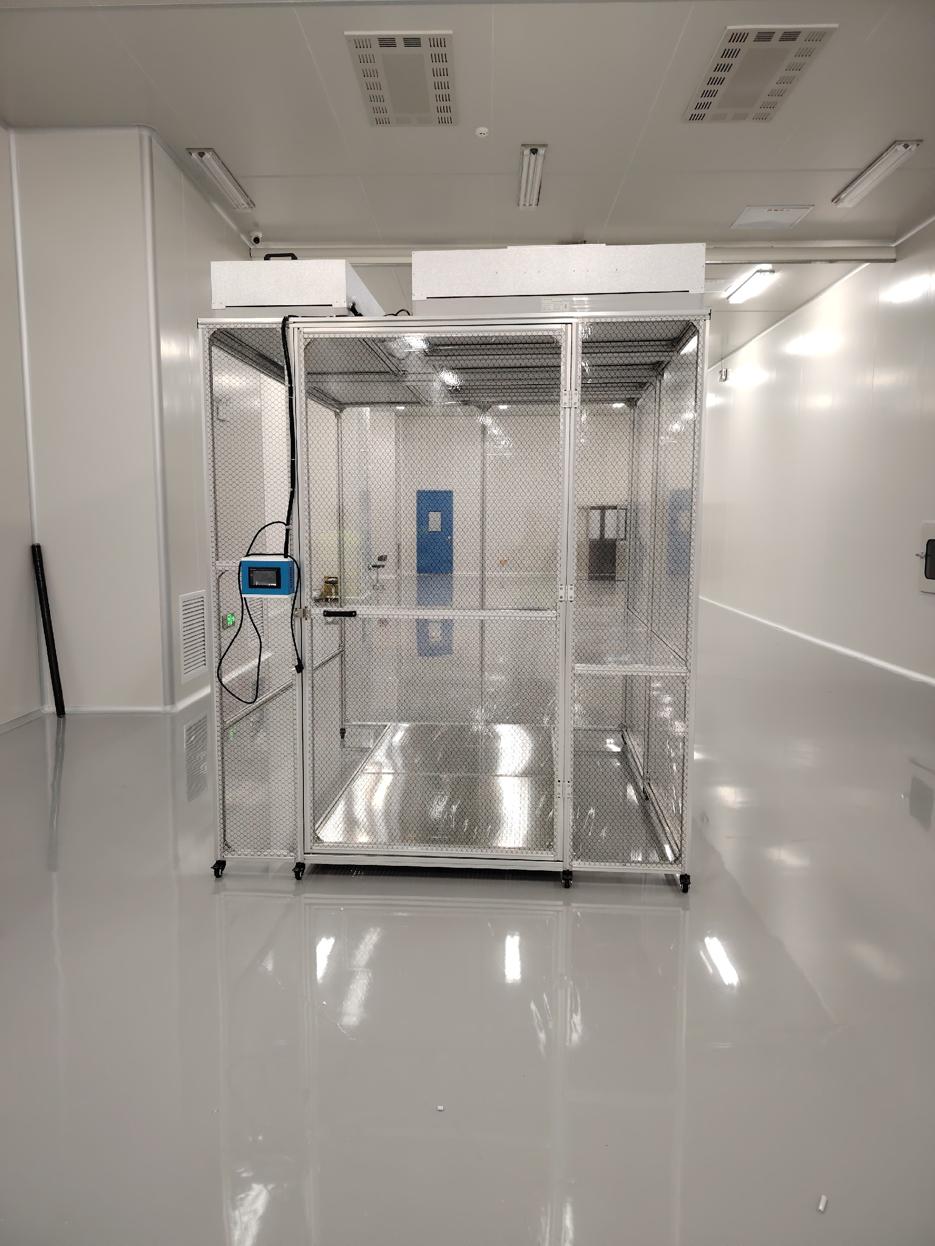 3、四周及盲區(qū)封防靜電網(wǎng)格簾,頂部含2臺凈化模塊1175*575*320mm